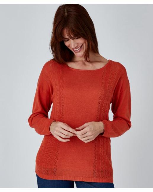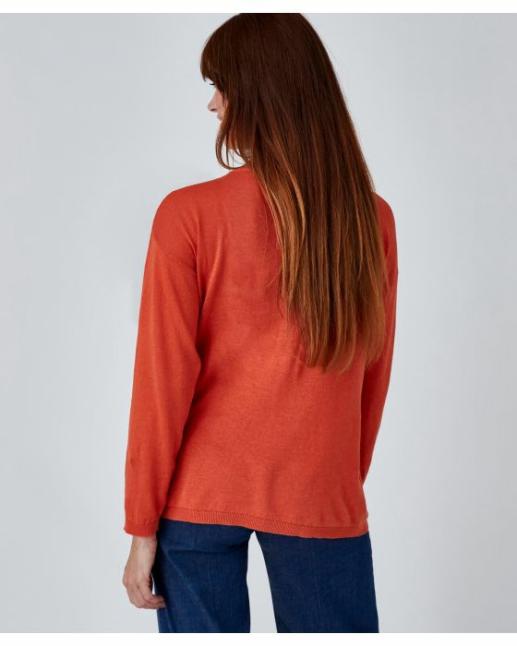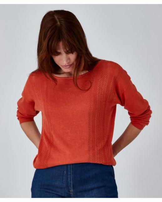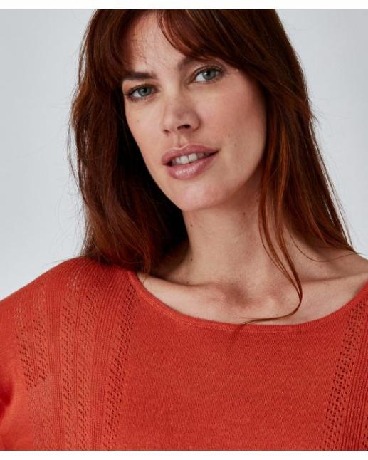 - ce mélange permet de préserver les qualités du lin face à la chaleur, tout en préservant la tenue et la solidité grâce aux fils de coton. A noter la féminité d’une fantaisie pointelle devant et des emmanchures descendues… la maille a du charme ! Et quel